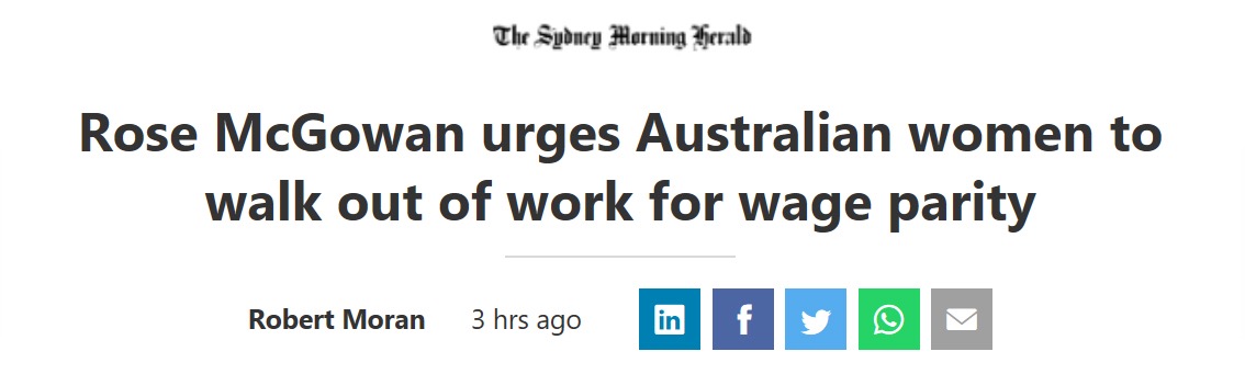 “Actress Rose McGowan is urging Australian women to walk out of work on Wednesday afternoon to demand pay parity.