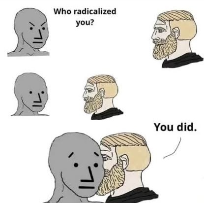 The mononarrative from the government and media is that faaarrrr rrrrright influencers on the internet and extreme extremist hate groups are radicalising White men to hate everybody. White men know this is nonsense, and the counterargument is summarised in a simple meme.