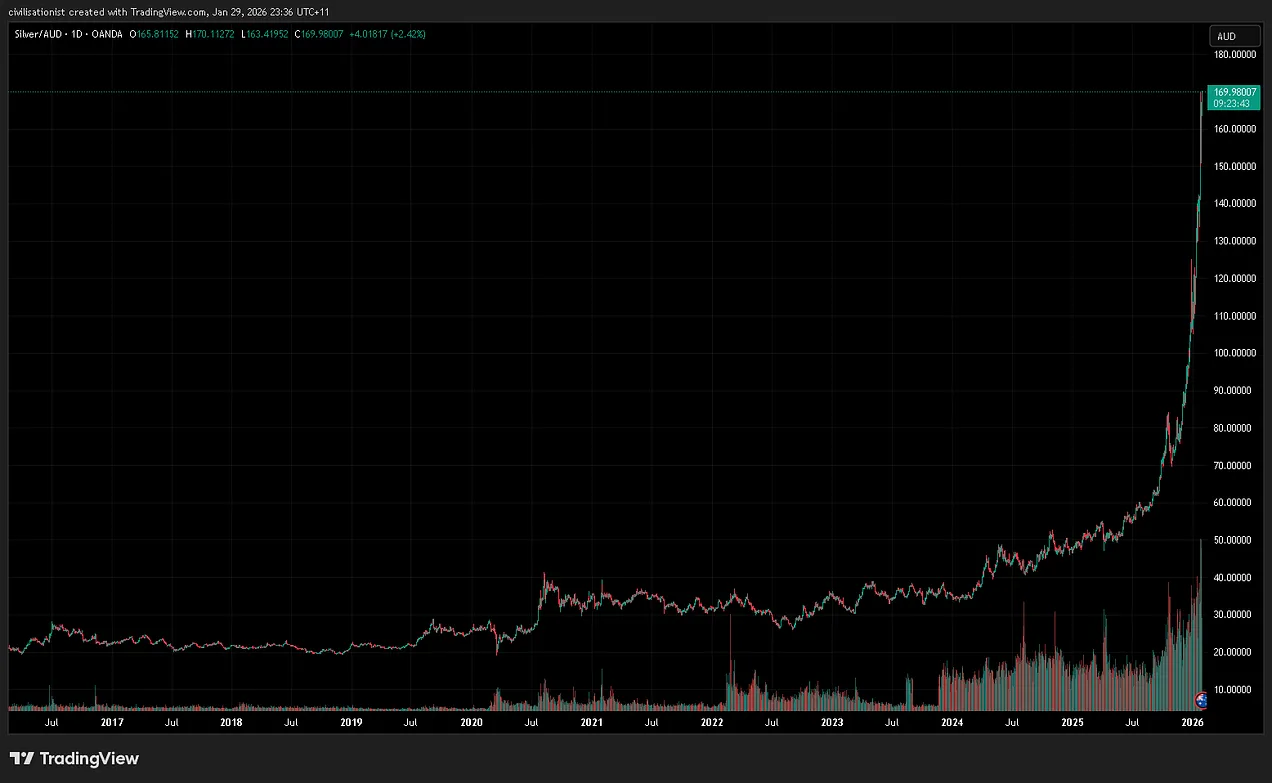 The recent action in gold and silver prices is a canary in the coal mine of the global financial system. Of the global civilisational system, really.