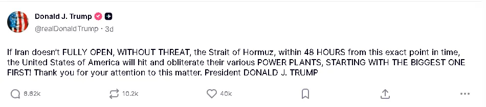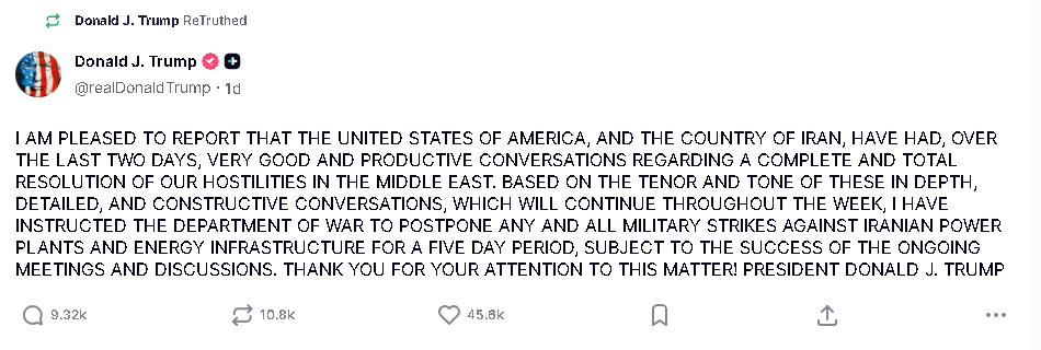 Right when the dramatic 48-hour period that had the world on edge was up, Trump posted this.